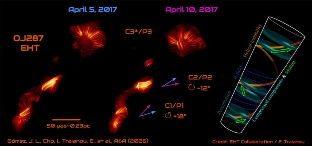 O sistema OJ 287 é conhecido por apresentar erupções energéticas periódicas, o que o torna um laboratório natural para estudar a física dos buracos negros supermassivos. O EHT observa o jato em regiões extremamente próximas do buraco negro principal, onde os campos magnéticos têm papel crucial na formação e na colimação, ou seja, no direcionamento, desses fluxos de energia.